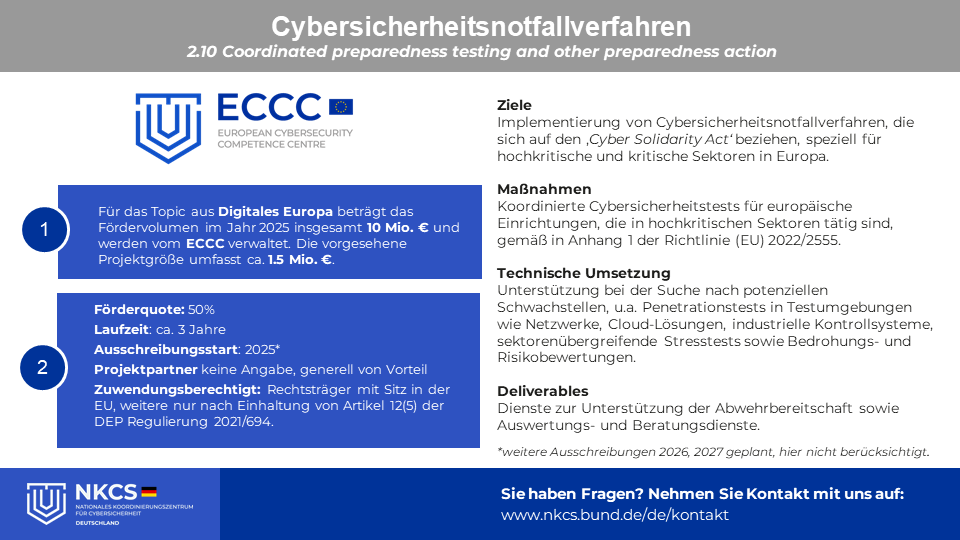 Als unterstützendes Informationsangebot haben wir eine deutsche Übersetzung des Förderthemas "2.10 Koordinierte Cybersicherheitstests und andere Vorsorgemaßnahmen" erstellt.