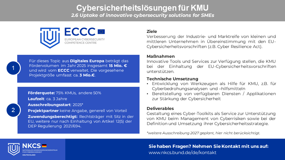 Das Förderthema 'Uptake of innovative cybersecurity solutions for SMEs', auf Deutsch nach freier Übersetzung "Innovative Cybersicherheitslösungen für KMU", soll mit Bezug zu einschlägigen EU-Rechtsvorschriften wie dem 'Cyber Resilience Act' die Cybersicherheit von KMUs verbessern.