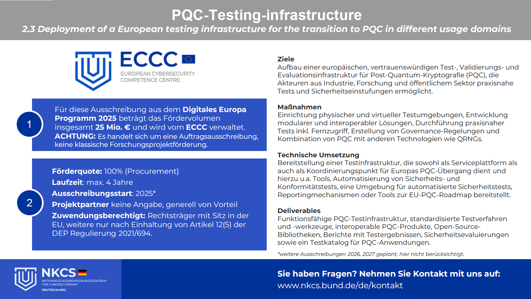 | Deliverables | Funktionsfähige PQC-Testinfrastruktur, standardisierte Testverfahren und -werkzeuge, interoperable PQC-Produkte, Open-Source-Bibliotheken, Berichte mit Testergebnissen, Sicherheitsevaluierungen sowie ein Testkatalog für PQC-Anwendungen. |